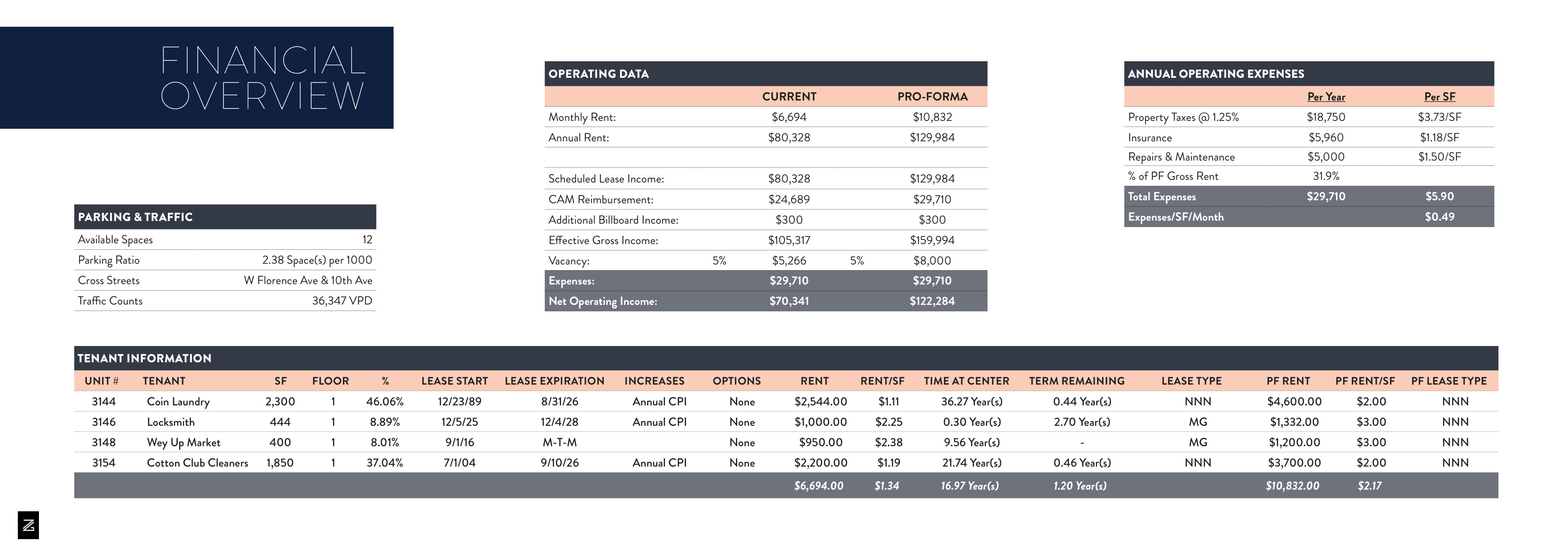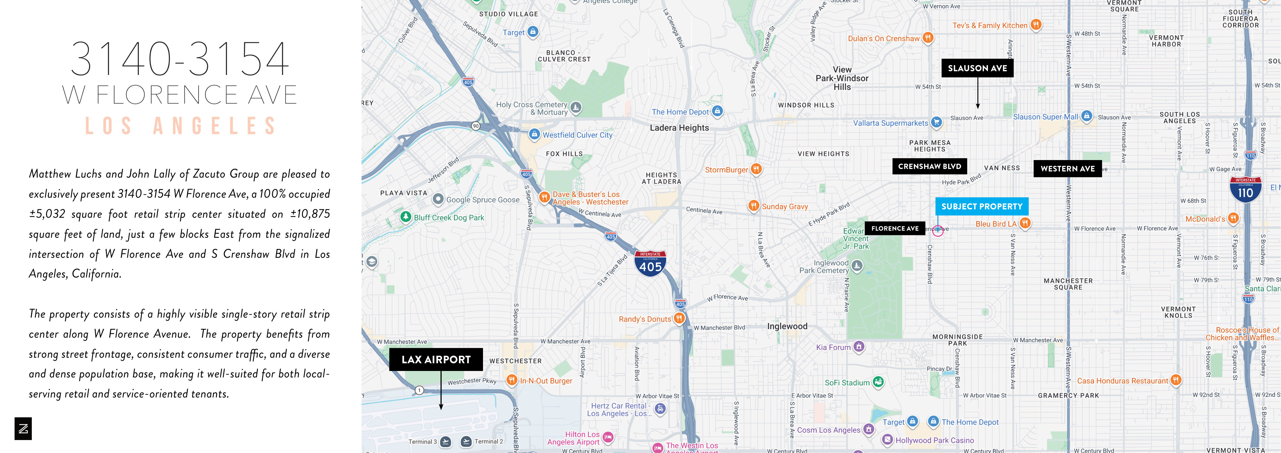 A 100% occupied plus/minus 5,032 SF retail strip center on plus/minus 10,875 SF of land, just a few blocks east of the signalized intersection of W Florence Ave and S Crenshaw Blvd. Single-story retail with strong street frontage, consistent consumer traffic, and a diverse, dense population base: well-suited for local-serving retail or service tenants, or for an owner-user.