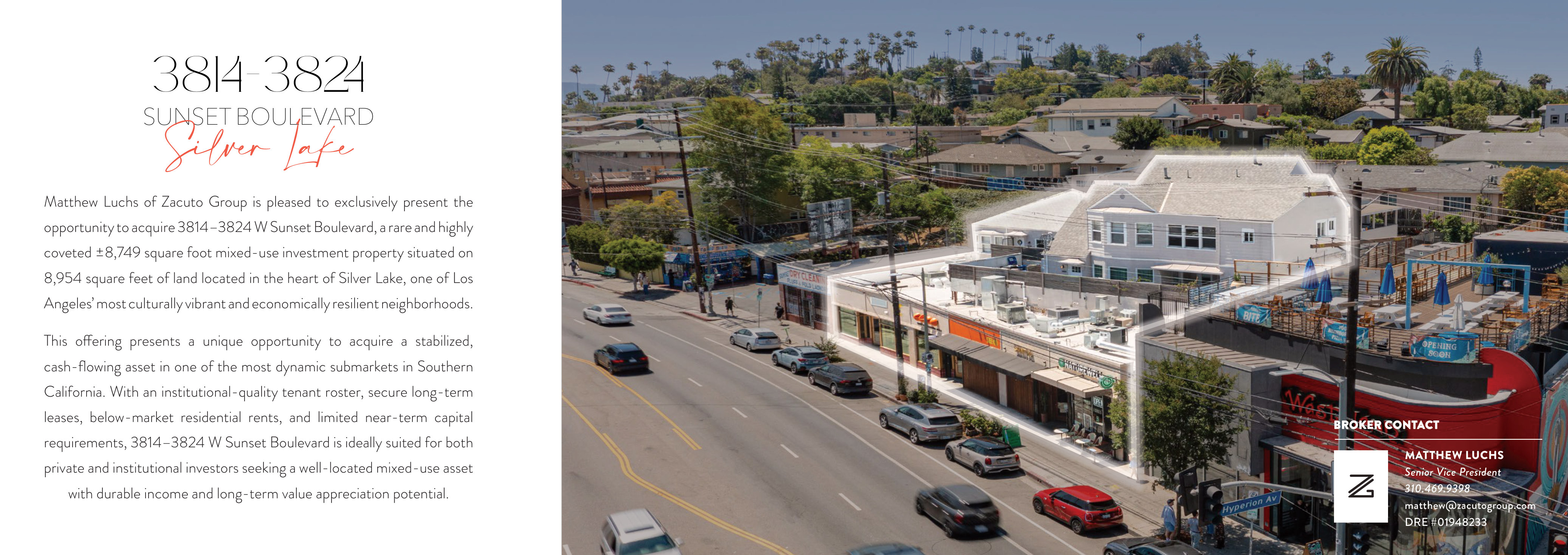 A rare plus/minus 8,749 SF mixed-use investment on 8,954 SF of land in the heart of Silver Lake, one of LA's most culturally vibrant and economically resilient neighborhoods. 4,338 SF of fully leased ground-floor retail across six suites, plus six renovated apartment units (plus/minus 4,411 SF) above. Curated, destination-driven tenancy including Le Labo Fragrances, Garrett Leight California Optical, Yala Coffee, Naturewell, Bar Secco, and Santo Sushi. Institutional-quality tenant roster, long-term leases with 3% annual bumps, and meaningful residential upside.