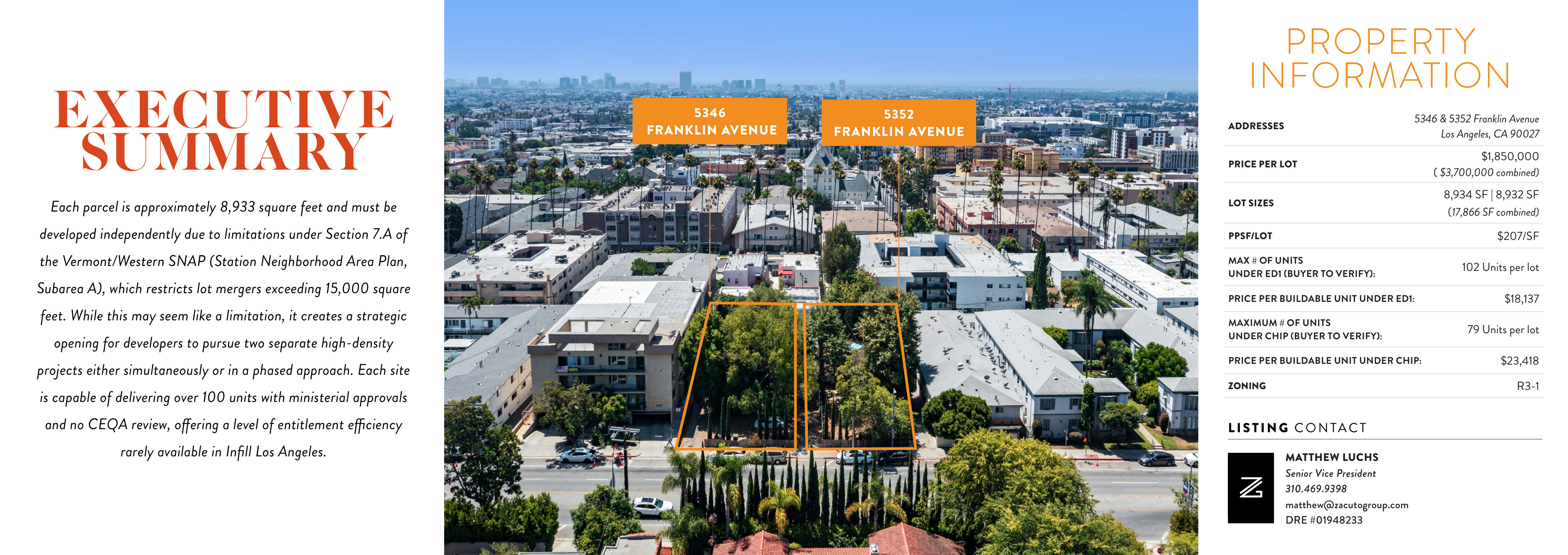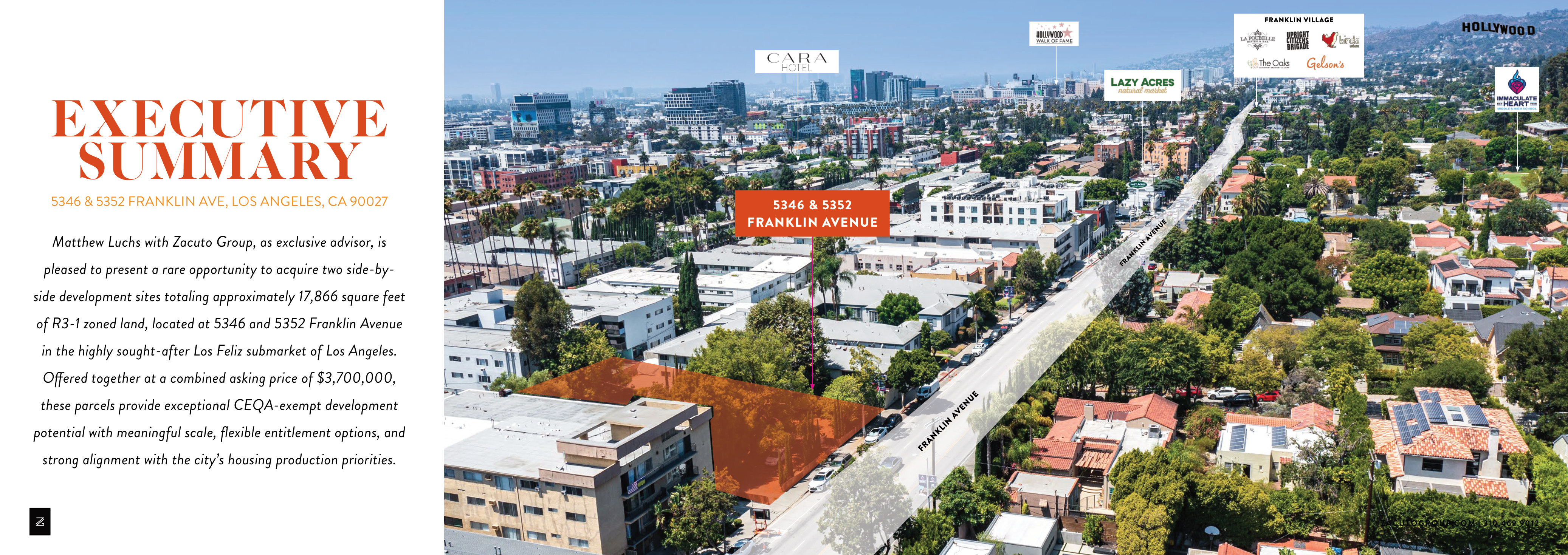 A rare opportunity to acquire two side-by-side development sites totaling approximately 17,866 SF of R3-1 zoned land in highly sought-after Los Feliz. Offered together at $3,700,000 or individually at $1,850,000 each, with exceptional CEQA-exempt development potential, flexible entitlement options, and strong alignment with the city's housing production priorities.