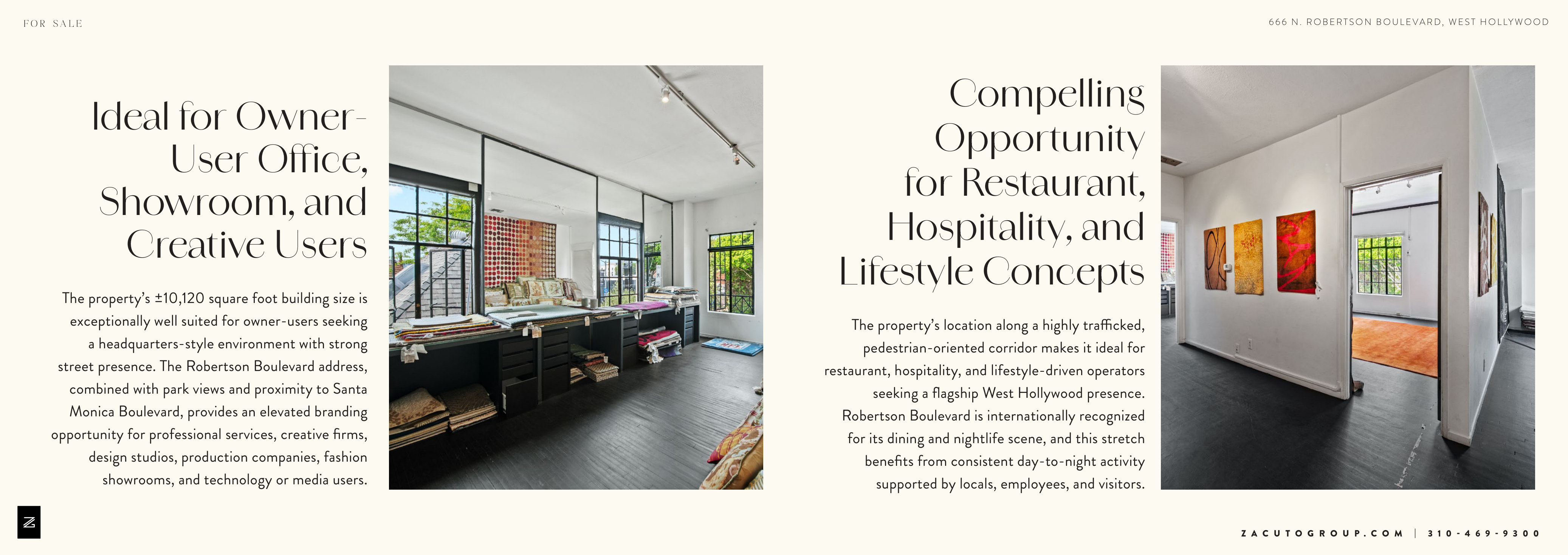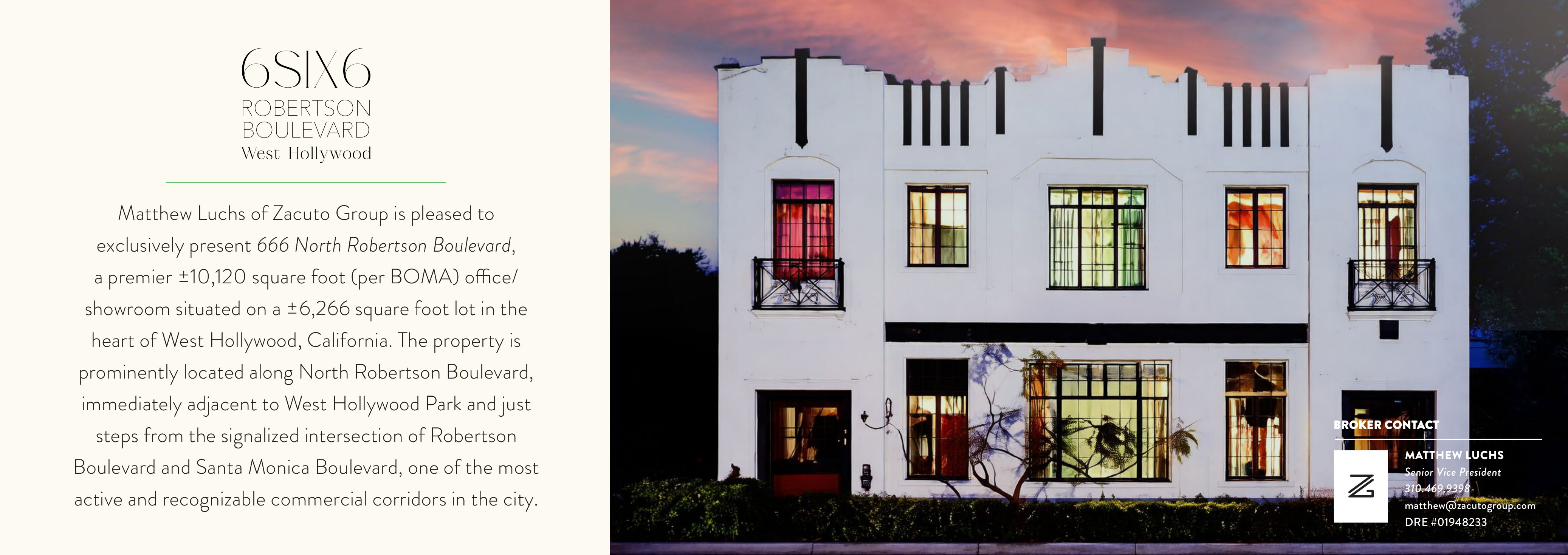 A premier plus/minus 10,120 SF (per BOMA) office/showroom on a plus/minus 6,266 SF lot in the heart of West Hollywood. Prominently located along N Robertson Boulevard, immediately adjacent to West Hollywood Park and steps from the signalized intersection of Robertson Blvd and Santa Monica Blvd, one of the most active and recognizable commercial corridors in the city. A rare opportunity for owner-users, investors, and creative tenants seeking scale, frontage, and flexibility.