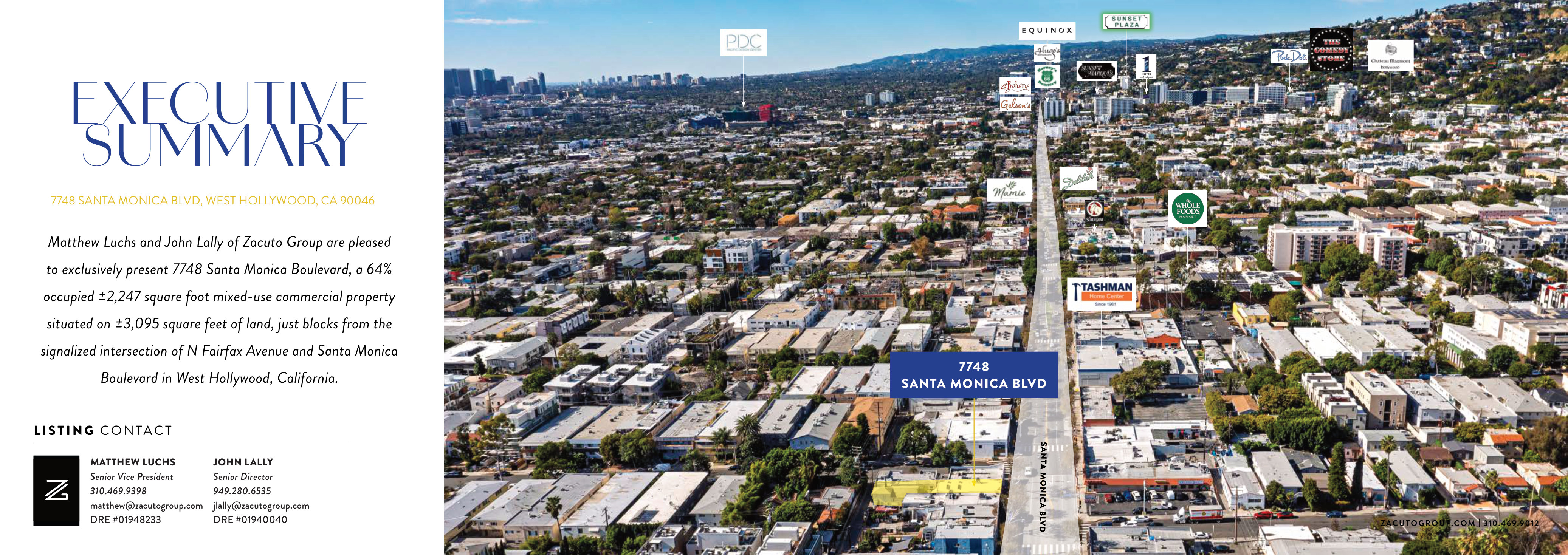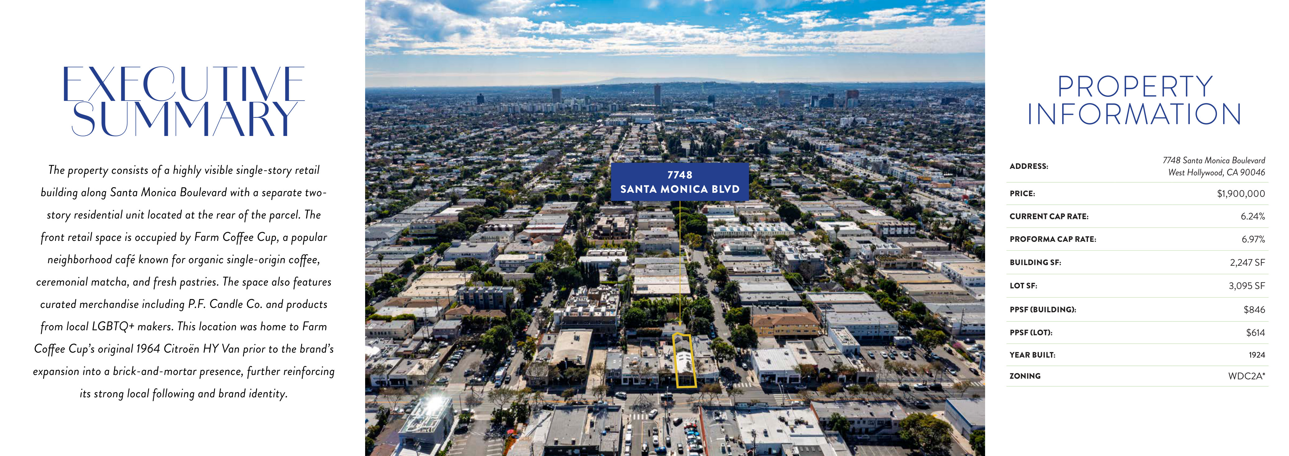 A 64% occupied plus/minus 2,247 SF mixed-use commercial property on plus/minus 3,095 SF of land, blocks from the signalized intersection of N Fairfax Ave and Santa Monica Blvd. The front retail space is occupied by Farm Coffee Cup, with a separate two-story residential unit at the rear. Ideal for an owner-user seeking exposure on Santa Monica Blvd, or an investor seeking immediate proforma upside.